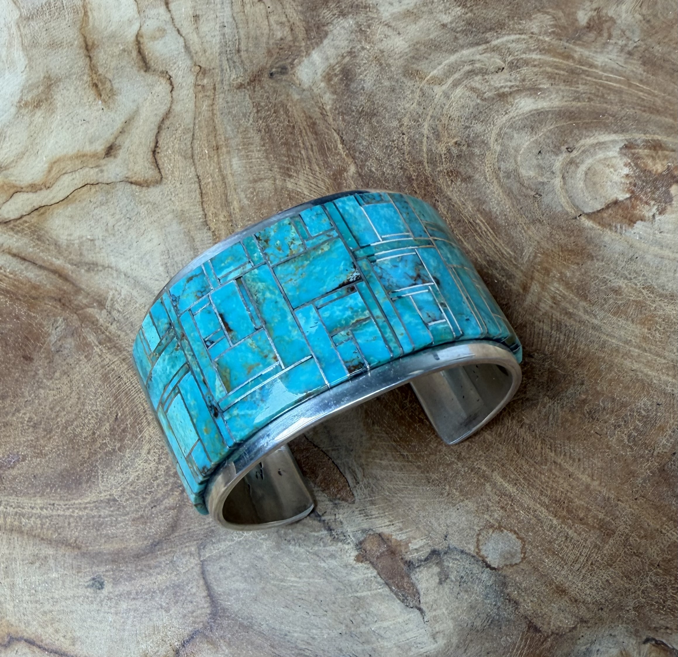 Made entirely of Sonoran Gold inlaid turquoise. Size 6.25” including gap. 1.5” wide throughout entire cuff.